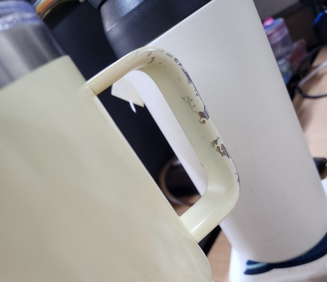 그리고 저녁에 오늘 사용한 텀블러를 씻는데 칠과 손잡이 본체 틈새로 물이 들어가기라도 했는지 칠이 들뜨는 느낌이더니 껍질처럼 시원하게 벗겨짐 ㅋㅋㅋ 하.. 사은품으로 주는 공짜 텀블러도 저러진 않겠다. 이런 걸 돈 주고 사다니 내가 호구지.. 차라리 돈 더 주고 유명한 텀블러를 사는 건데.. MD 상품 퀄리티 못 미더워서 더 이상은 못 사겠다...